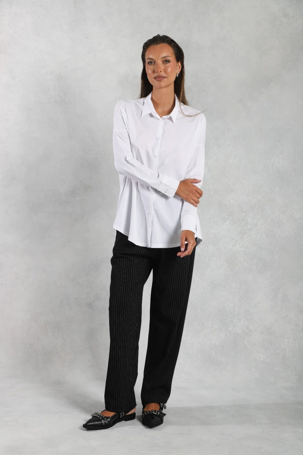 Camisa oversize en poplin de rayon spandex con tabla en espalda, tajitos laterales y tirilla para regular la manga